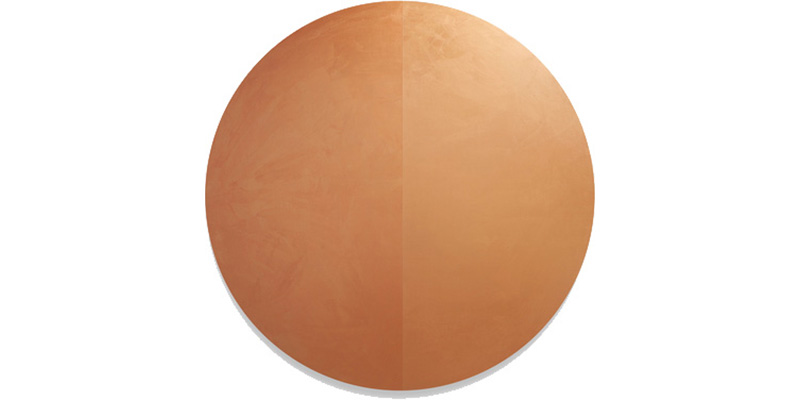 The Tondos are large enough to feel almost like portals into a world of pure color. The depths and roil of purple in Violet Idyl contrast with the elegant golden orange of Cyprian Tondo. A piece like Rosa Reverso shifts dramatically from a subtle, dusty rose-mauve to a shining gold, while a piece like Over & Under Lavendar seems to shift through every possible permutation of the color. The smaller works, move differently but still shift and shine remarkably. From the greeny undertones within the copper sheen of Yellow Copper 6 to the moody aqua of Ryder 6 or the frosted and shadowed orchid-magenta Small Universe, these pieces present a continuing evolution of colors.