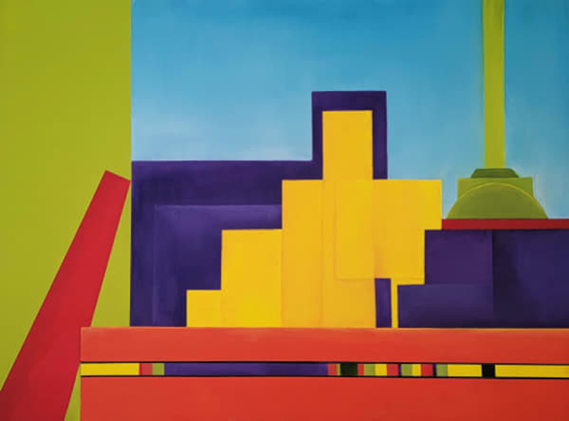 As gallerist and curator, Bill Thomason, explains, “The dialogue between Barton’s intentional, minimalistic, geometric abstractions and the brash, charged, almost reckless brushstrokes of Espinosa’s abstract expressionism, anchored by Eccher’s darker, urban, and dense neo-primitivism sitting between them, creates a dynamic field of exchange without tipping into visual excess.” He goes on to say, “The tension, push and pull, and underlying sense of unease I wanted the viewer to experience required a very specific dialogue between the works.”