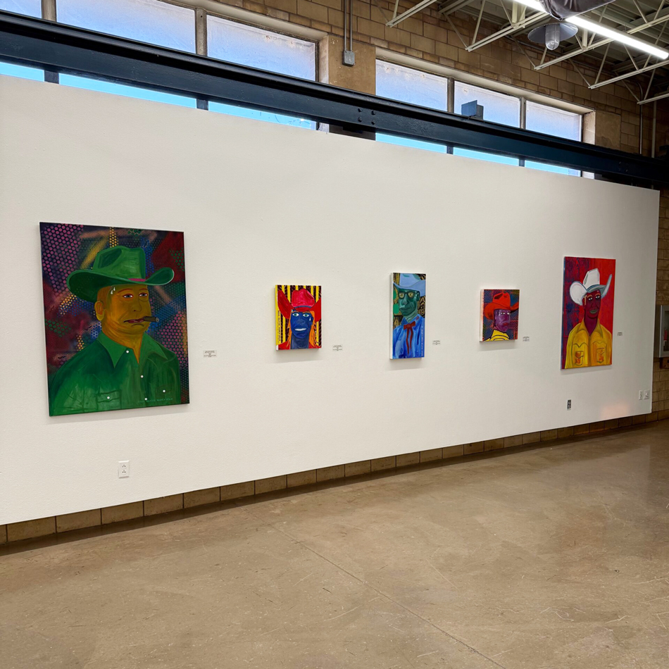 For as long as I have memory, I have been interested in cowboy imagery, films, tradition, advertisements, and the like. A childhood spent watching Gunsmoke, Bonanza, and the Lone Ranger had me fascinated with cowboys from an early age. When I started these paintings, we had been living in Lubbock for about 6 years, and I spent a lot of time considering the positive and negative impact of environment and change and looking for inspiration. After more than 20 years as a metal worker, blacksmith, and welder I found inspiration in a brush and in painting. Around that time, I inherited my father’s hat collection and considered both the presence this mountain of a man had in my life, and the presence of a cowboy out on the West Texas plains. The portraits in the exhibition were all painted with oil-based media and various enamel spray paints.