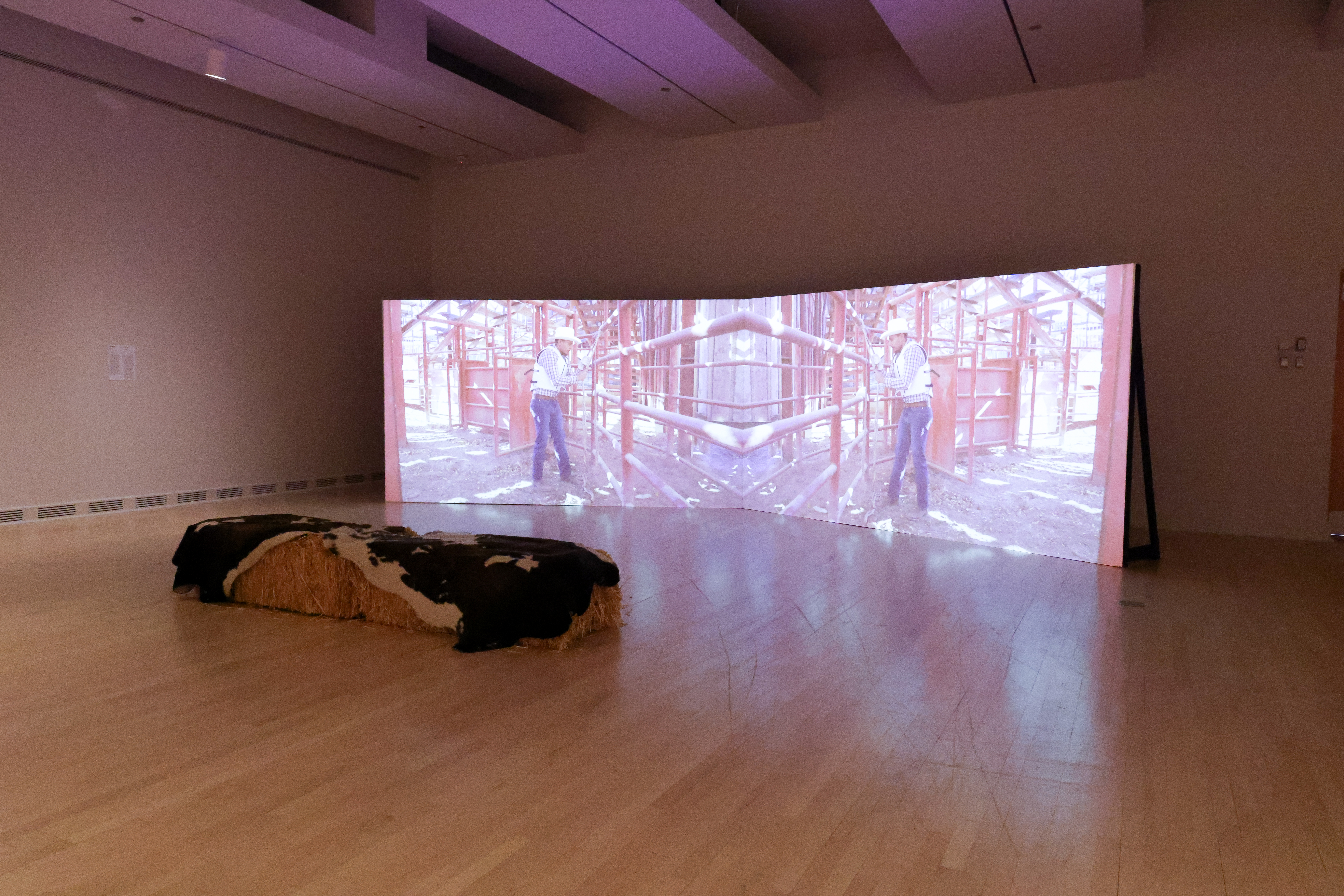 José Villalobos is queer multi-media artist who grew up on the border between El Paso, Texas, and Ciudad Juárez, Mexico, immersed in Norteño culture and his conservative Mexican family’s values. His work repeatedly references the machismo of Norteño culture, in order to subvert it. His shows often include performances, in which he utilizes the traditional visual language, objects, and clothing of cowboy and bull-riding’s hyper-masculine culture, in order to critique and challenge gender roles and expectations. Such is the focus of his first U.S. museum exhibition, at Arizona State University Art Museum: José Villalobos: Rough Rider. In concentrating on the effects of bull-riding culture and Brown queer identity, however, the exhibition offers only a glimpse into the concerns of Villalobos’s broader practice.
