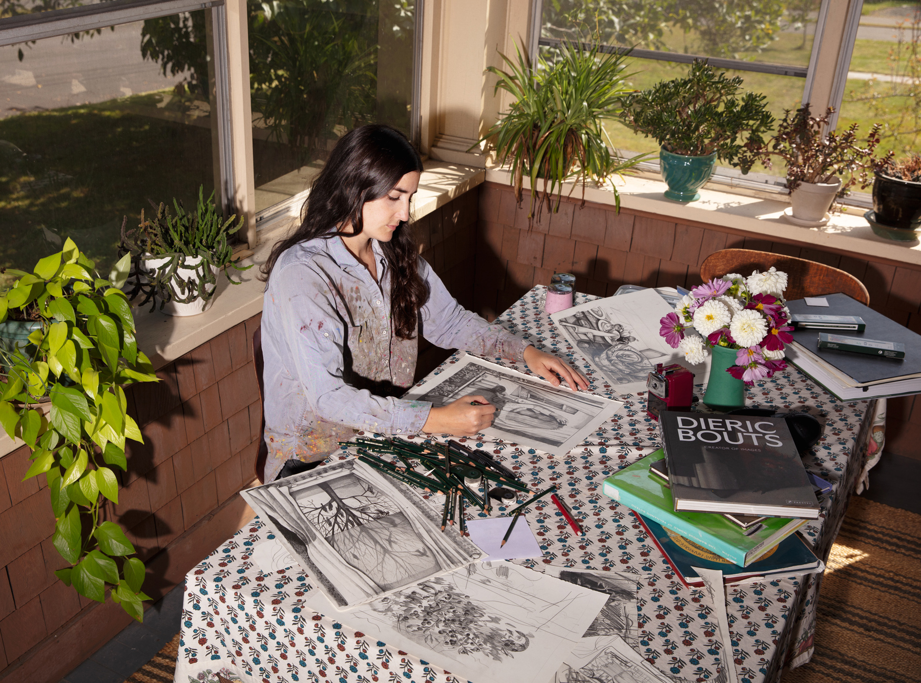 Tamarind was delighted to invite Massachusetts-based American artist Nikki Maloof to the workshop for the first time. In her paintings, Maloof assembles interiors of strangely humorous yet poignant domesticity. Populated by plated tables, curious cats, underfoot dogs, and wildly detailed flora, her paintings teeter between the quiet melancholy and explosive absurdity of the home, and the unpredictable rhythms of joy and disquiet that underlie the human experience.